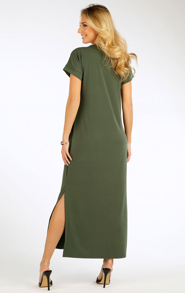 Dlouhé dámské šaty s krátkým rukávem v moderním střihu, který zaujme čistými