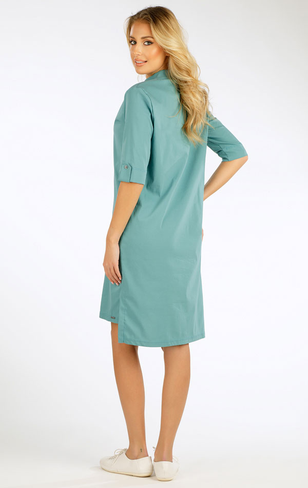 Elegantní šaty se stojáčkem a otevřeným výstřihem. Model doplňuje rukáv